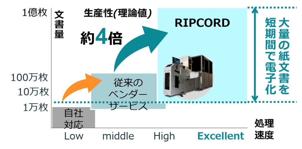 ロボティクス活用により大量処理/高生産性を実現。従来のスキャン方式で大量の文書量を短期間で実施する場合は、通常複数ベンダーの並列処理が必要であり、品質/納期管理の課題があった。