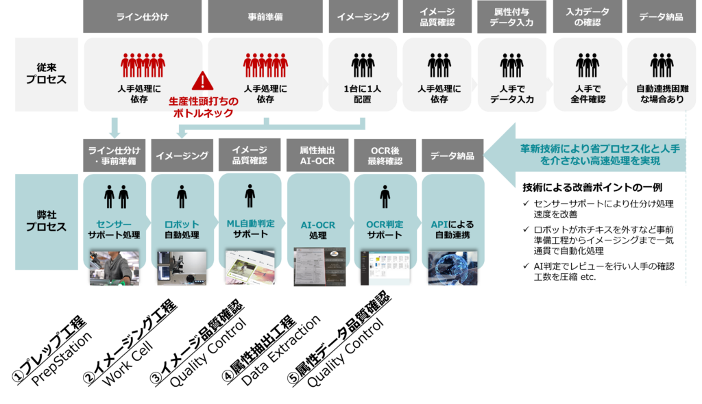 最新のロボット工学 / 機械学習 / 人工知能を駆使し、従来人手の作業に依存していたデジタル化プロセスを自動化することで”大量文書のデジタル化を短期間”で実現。