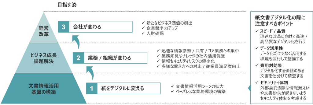 迅速な経営改革に向けて着実にステップアップするためには、「デジタル化のスピードと品質の両立」「着実な活用につながるデータ生成と環境の整備」「デジタル化する価値のある文書の見極め」「デジタル化処理中の品質事故や業務影響リスクの極小化」についてケアしながらデジタル化を進めることが重要です。
